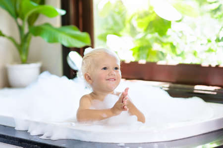 小さな子供は 大きな庭の景色の窓と美しいバスルームで泡風呂を取ります 子供の衛生 子供のためのシャンプー ヘアトリートメント 石鹸 大浴槽で入浴する子供 髪に泡を持つ男の子 の写真素材 画像素材 Image